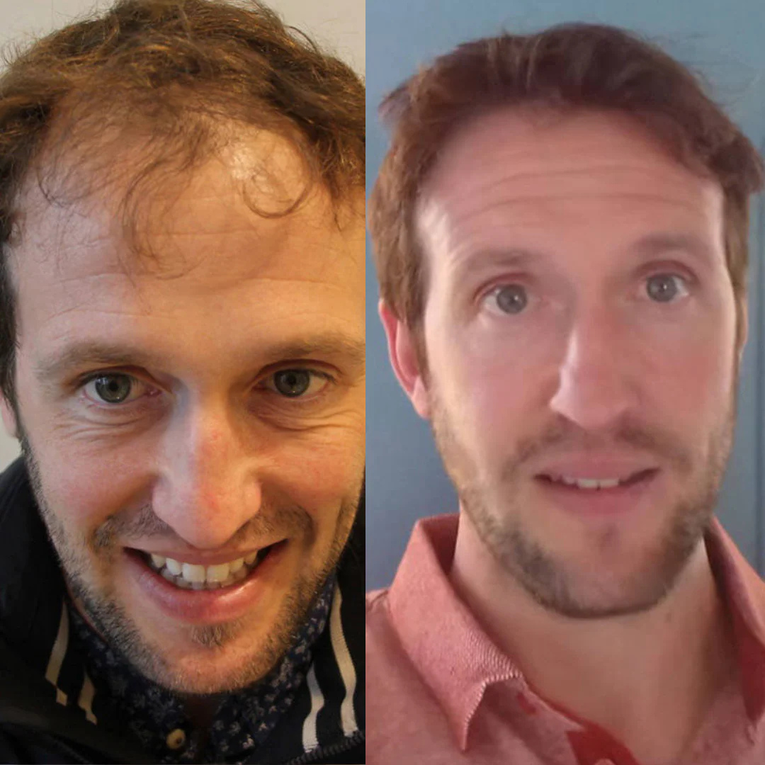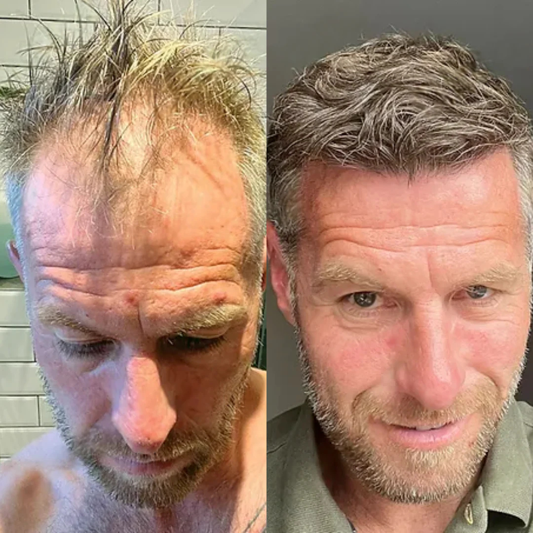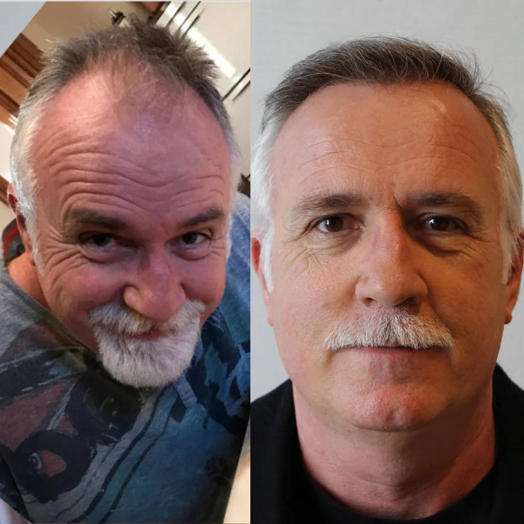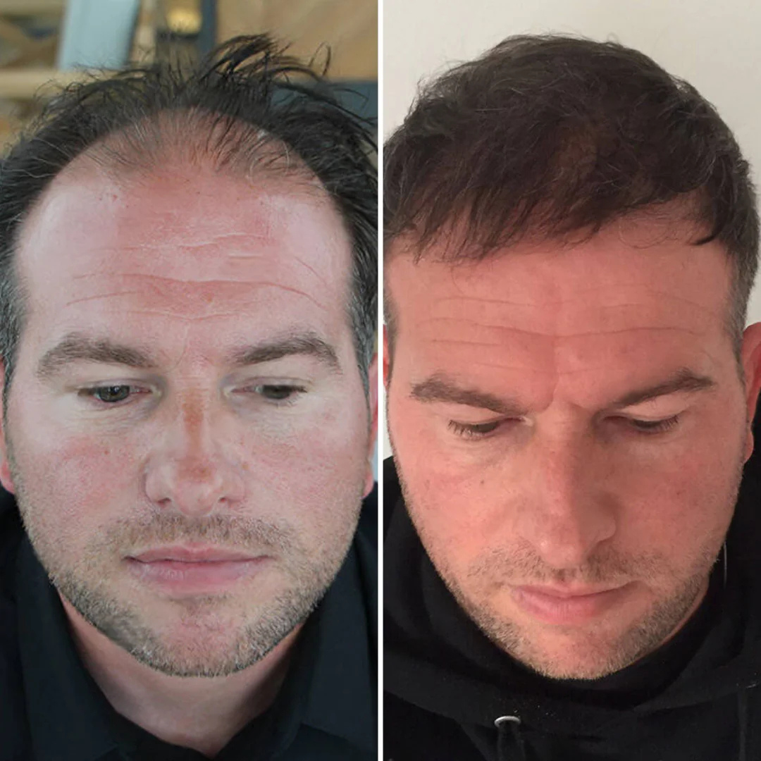 Avevo provato tutto per più di 12 anni, senza risultati. La mia linea frontale stava sparendo e sembravo molto più vecchio. Con la micro-infusione ho iniziato a vedere nuovi capelli dopo poche settimane. Dopo 3 mesi la linea frontale era già più piena, e dopo 7 mesi i miei capelli sono tornati spessi e forti.Sembro 10 anni più giovane e userò il kit di mantenimento per non perdere i risultati.